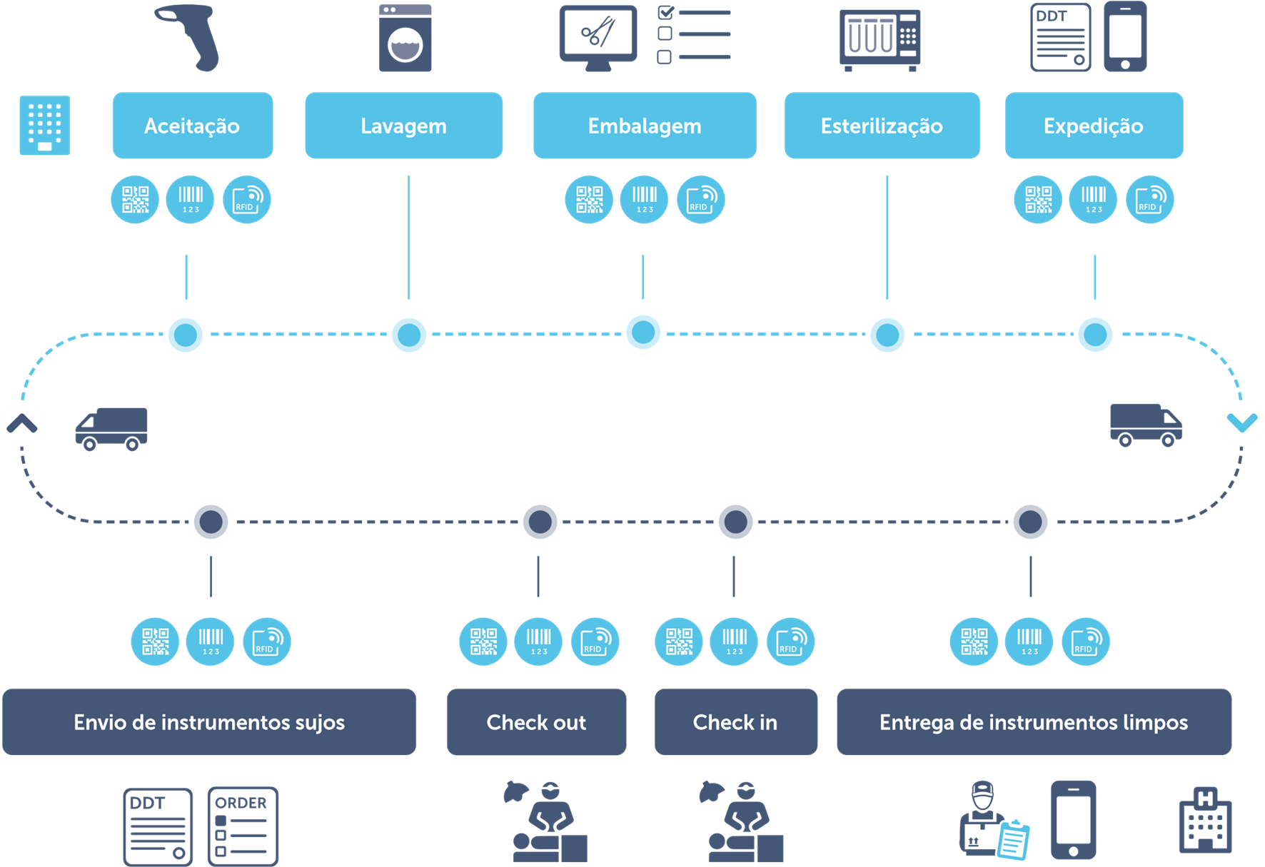 A nossa solução de rastreabilidade para instrumentos cirúrgicos tem a particularidade de se moldar ás necessidades do clientes, com módulos em todas as bases essenciais para que a rastreabilidade se mantenha e não haja falhas entre postos de trabalho, que neste caso será o controlo absoluto do instrumental cirúrgico e o seu percurso entre a esterilização e os outros serviços, sejam eles internos (cons. externa; urgência; bloco operatório) ou externos (centro de saúde), sendo possível reunir toda a informação desde que sai esterilizado até que retorna para esterilizar para ser reprocessado.